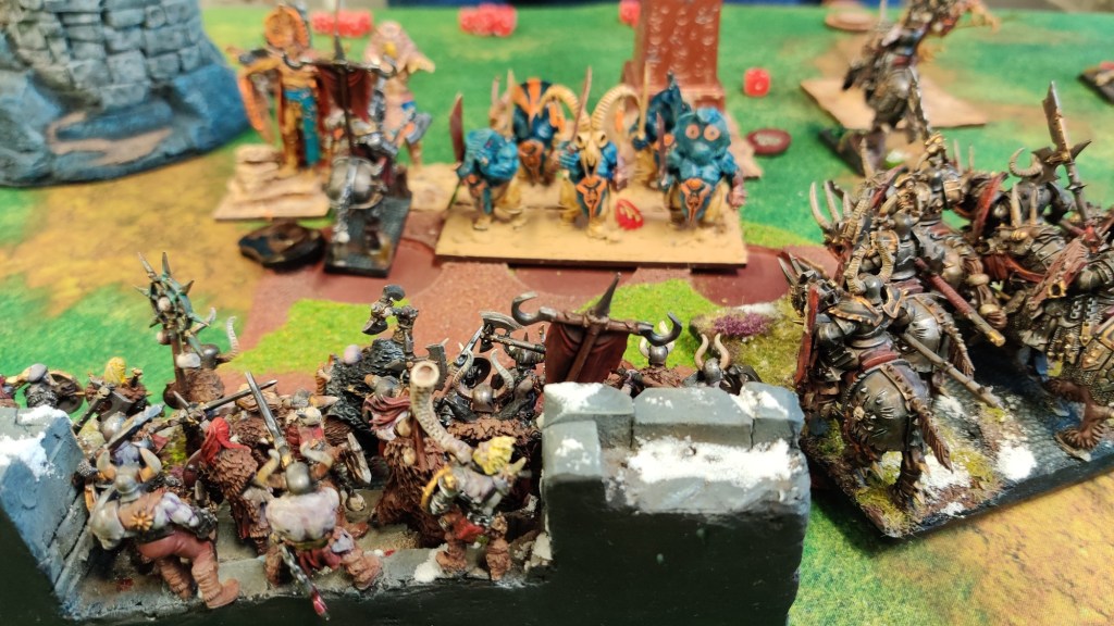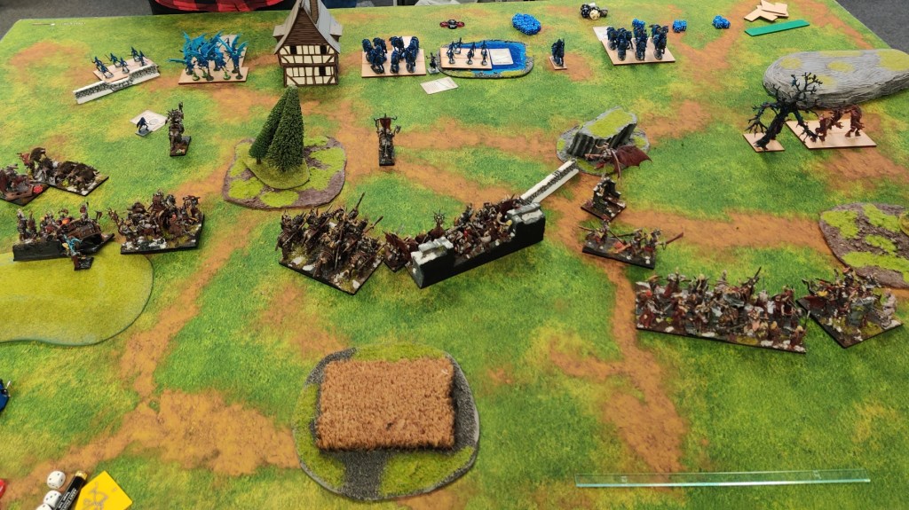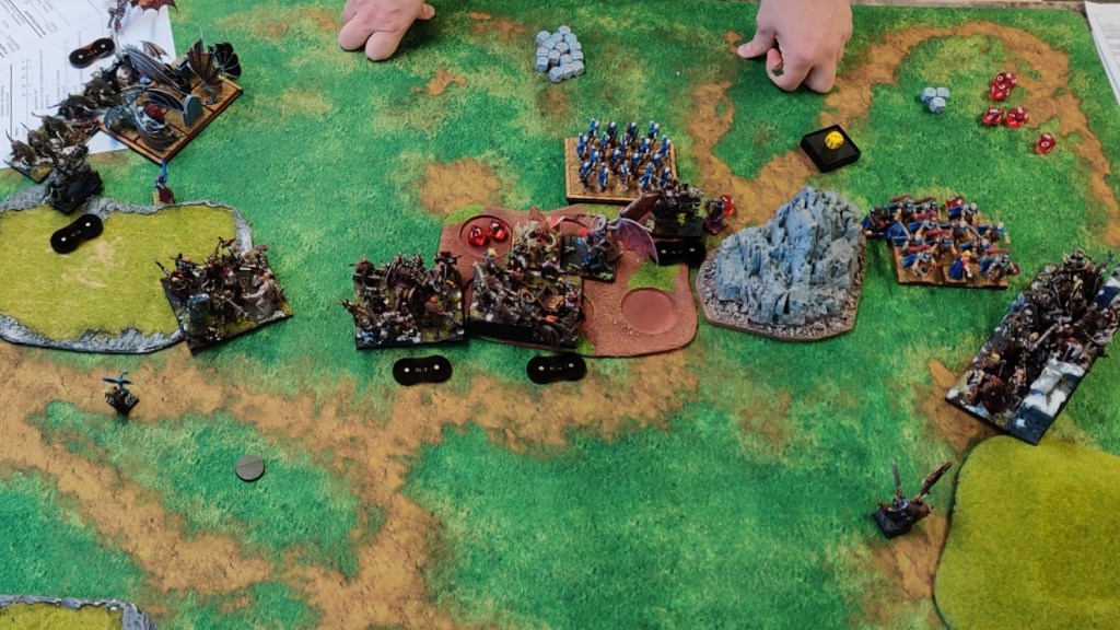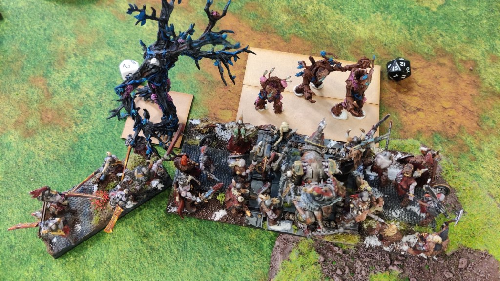 I now had an issue where I needed my right flank flyer in the middle, which left me without inspiring on the right flank. Again, in hindsight, the right flank should have had a bane chanter in their midst, as they were up against the damned trees. As I had to charge the treekin through terrain, and without banechant, I missed breaking them by one point after putting 12 wounds on them. That was just the first of many break-tests that was missed by one. That miss meant that the tree herder got a flank on the horde, and with the treekin, they managed to kill the horde in one go, which eventually lost me the right flank.