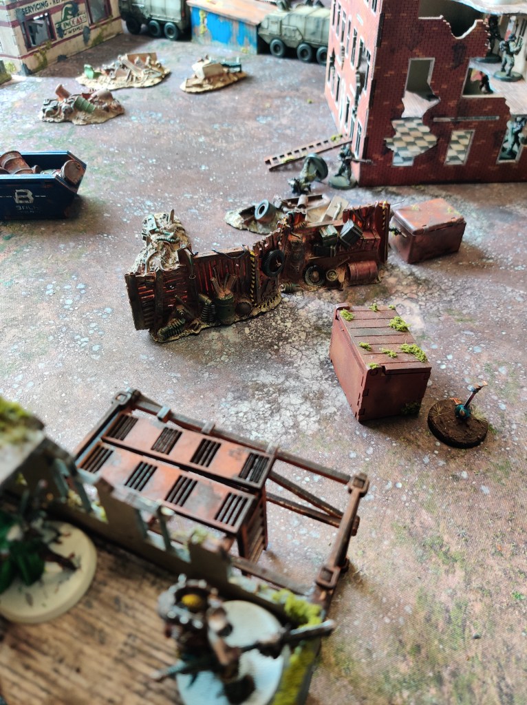 The trail ended at a warehouse complex in Numarc Prime. As the team moved forwards to search the warehouses, a group of 10 militia attacked, opening fire with las and slug guns. UR-025 and Jiath both responded in kind, taking first blood.