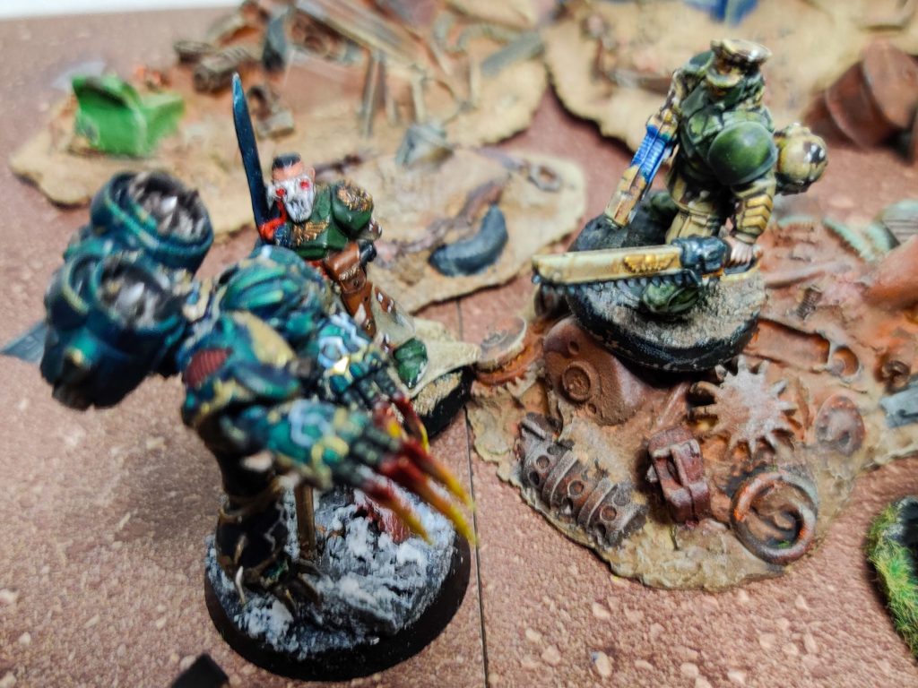 This was an insane combat. The warp talon split his attacks, and got two hits on Mattius, who was on one wound left, but Mattius saved both on 6+. Hitting back, Mattius put two wounds on the warp talon too, and he was also on his last wound. However, he also managed two 6+ saves, leaving both main combatants standing, and just the sergeant, with the last plasma pistol, torn to pieces.