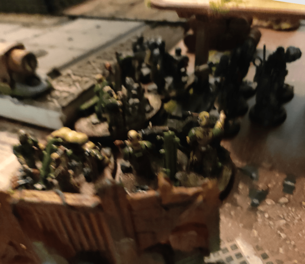 Most of the 176/32nd are grouped around the supply truck and the promethium refinery. Jeager’s and the preacher’s squads move up and secure the promethium refinery, while the other squads take pot shots at the approaching rebel mob. The large amount of flamers and small arms means that it is suicide for the rebels to charge into the open. Both sides stay in cover and maneuver for advantage, and only a few men from each side are injured in the opening stages of the engagement.