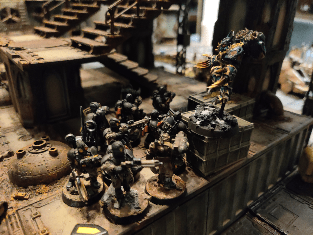 Jeager and his men had secured a cache of weapons, and from their commanding position in cover above the renegades, they were punishing the enemy. Suddenly, a horrible shriek accompanied by the sound of a jet engine screamed in from above. Before the squad had time to react, a massive creature clad in power armour slammed into them from above, squashing a man beneath its clawed feet. Crackling lightning claws struck out, severing limbs.