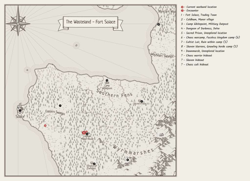 Travelling along the eastern road out of Fort Solace, they spotted something.. unnatural out in the dawnmarsh. They noted it down on the map they had procured from the burgomeister, but continued on their way to Coldham. (travel event – unknown location)