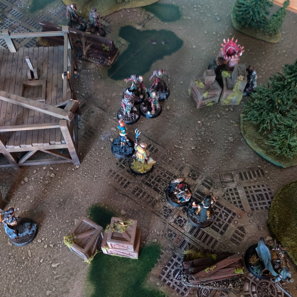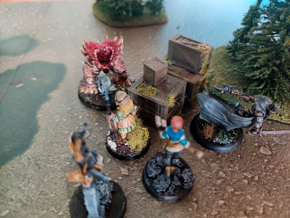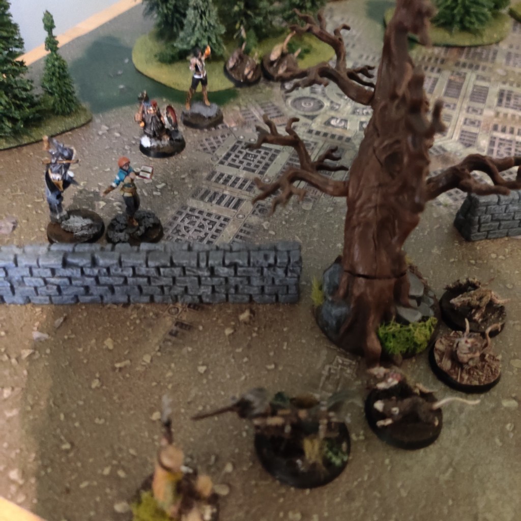 A small horde of giant rats streamed towards them on the road, seemingly guided by an ethereal looking hound. As the rats came from the road, there was not a lot of obstacles in the way, and the Saints readied their ranged weapons. Luckily, the weather had calmed somewhat, allowing them to use arrow and stone with precision. Ulrike started the hunt, claiming a giant rat with the first bolt off her crossbow. Shade weaved her magic, her magical roots holding the hound in place, allowing Ironbeard to launch a precise stone right in it’s head. While it looked etheral, it was corporeal enough for it to roar in pain and sink together. Odo also claimed a kill with his sling, and then Ironbeard and Ulrike held the frontline, slaying rats until the final few scattered with their tails between their legs. (Got a very easy match-up, and the rolls for table edges gave some opportunities for shots without cover. With the warband now loaded up with 5 ranged weapons, it was easy to pick off most of the weak enemies and then just dispatch the last few in defensive combat with +2 for combat skill and support)