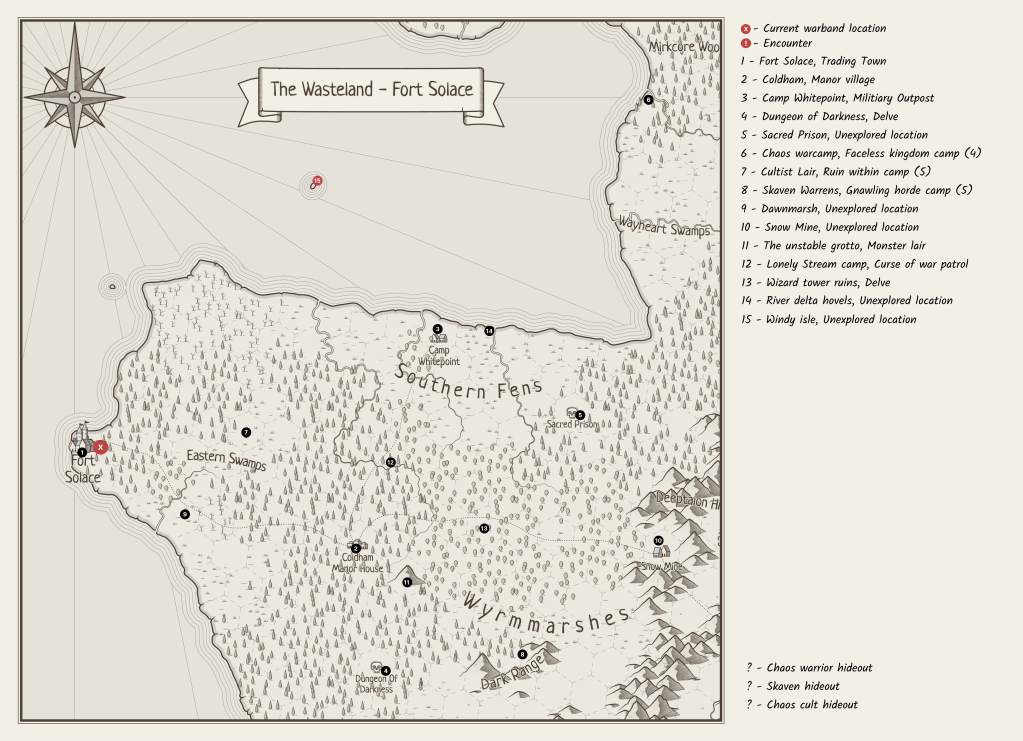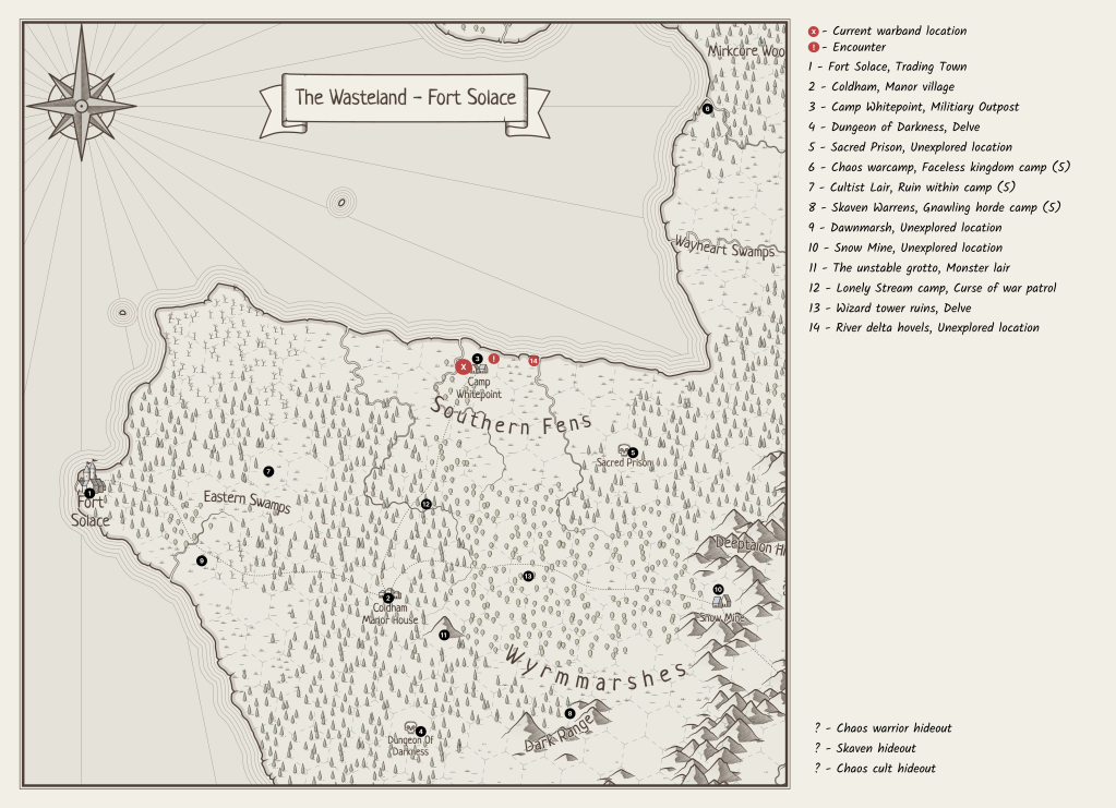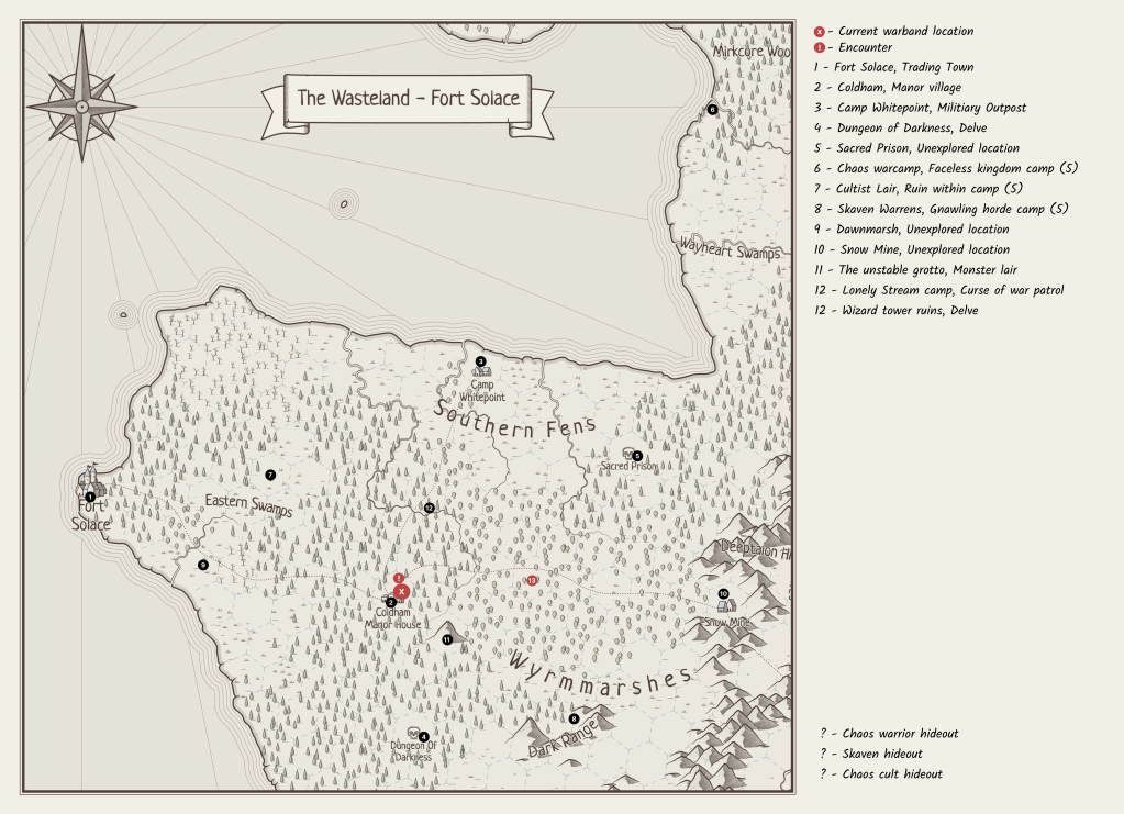 Back in Camp Whiteshield, Ulrike’s old friend Igor arranged for free rations for the group. Ironbeard visited the camp surgeon, and was back on his feet. Igor offered to pay some gold if the Saints would stay and patrol the area, securing his operation. However, the offered gold was not enough, and Igor already owed Ulrike a favour, so she declined his offer. Igor was understanding, and told Ulrike about some contacts in Fort Solace she could use if needed. (Town event: got a pack of rations. I helped the guards and visited the healer, getting Ironbeard back. Got a new contract offer from friend. Aid community, 3 patrols within turn 17. D3 gold + 1SP. Not worth three patrols for the poor pay. News event gave me “letter from a friend”, giving me another SP)